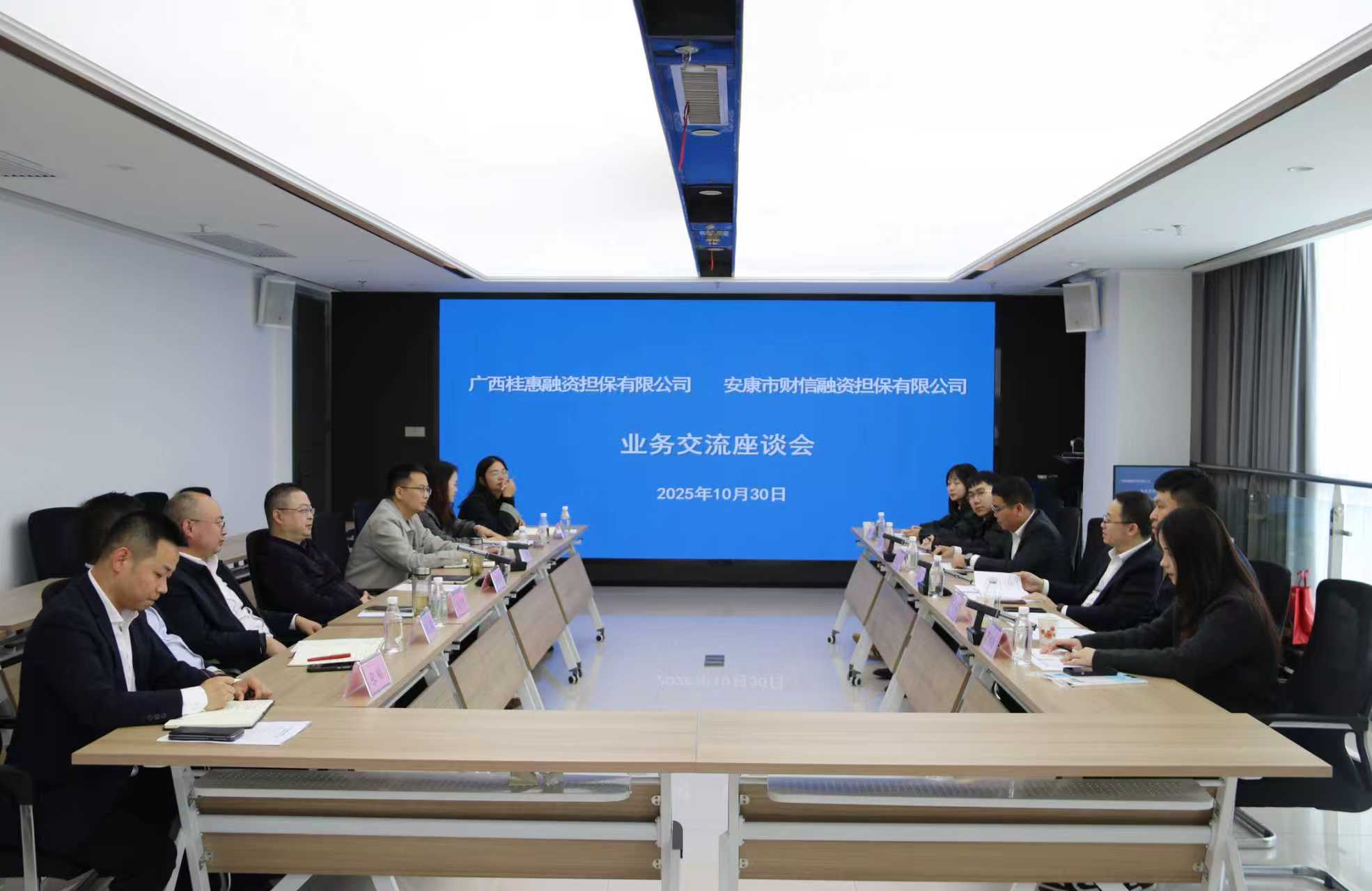 10月30日,廣西桂惠融資擔(dān)保有限公司副總經(jīng)理潘誠一行6人來安康財(cái)信擔(dān)保開展交流座談。安康財(cái)信擔(dān)保董事長滕海濤,副總經(jīng)理張萬坤及公司業(yè)務(wù)、風(fēng)控、法務(wù)、財(cái)務(wù)、綜合部門負(fù)責(zé)人參加座談會(huì)。